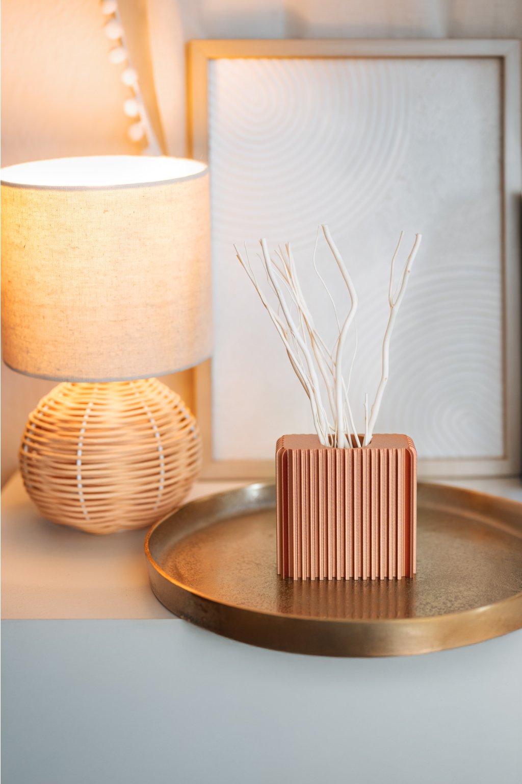Elegantní a moderní difuzér Cubo od FIEDLER DESIGN přináší harmonii tvaru a vůně. Saténový povrch s výraznou strukturou pruhů zachycuje světlo a proměňuje jej v jemnou hru odlesků. Uvnitř se skrývá skleněná vložka, která zaručuje dokonalou odolnost vůči chemikáliím a čisté uvolňování esence. Přírodní větvičky z pravého dřeva rozptylují vůni s přirozenou elegancí a vytvářejí atmosféru klidu, stylu a tepla domova.