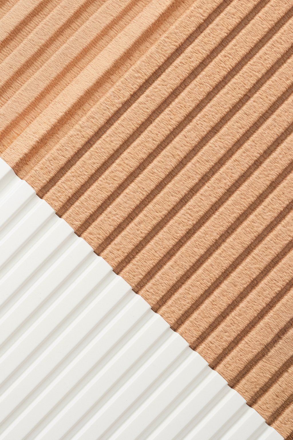 - Elegantní spojení saténu a dřeva s výraznými pruhy
