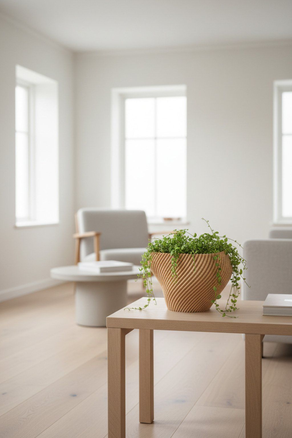 - Solitérní charakter: Květináč exceluje jako samostatný prvek, ale její vertikální linky se nádherně doplňují s minimalistickými přírodními prvky, jako jsou suché trávy nebo solitérní větve.