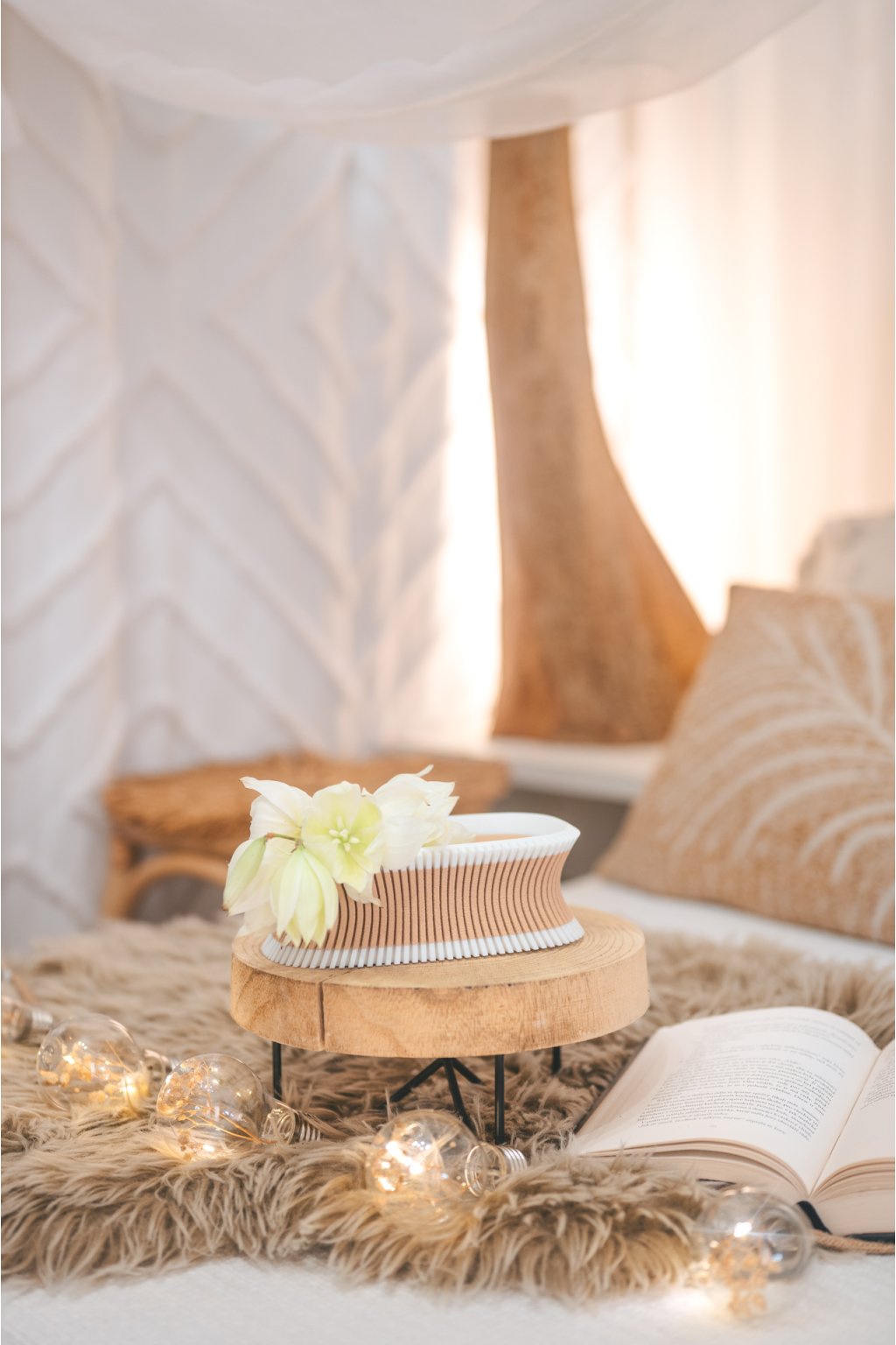 - Elegantní spojení saténu a dřeva s výraznými pruhy
