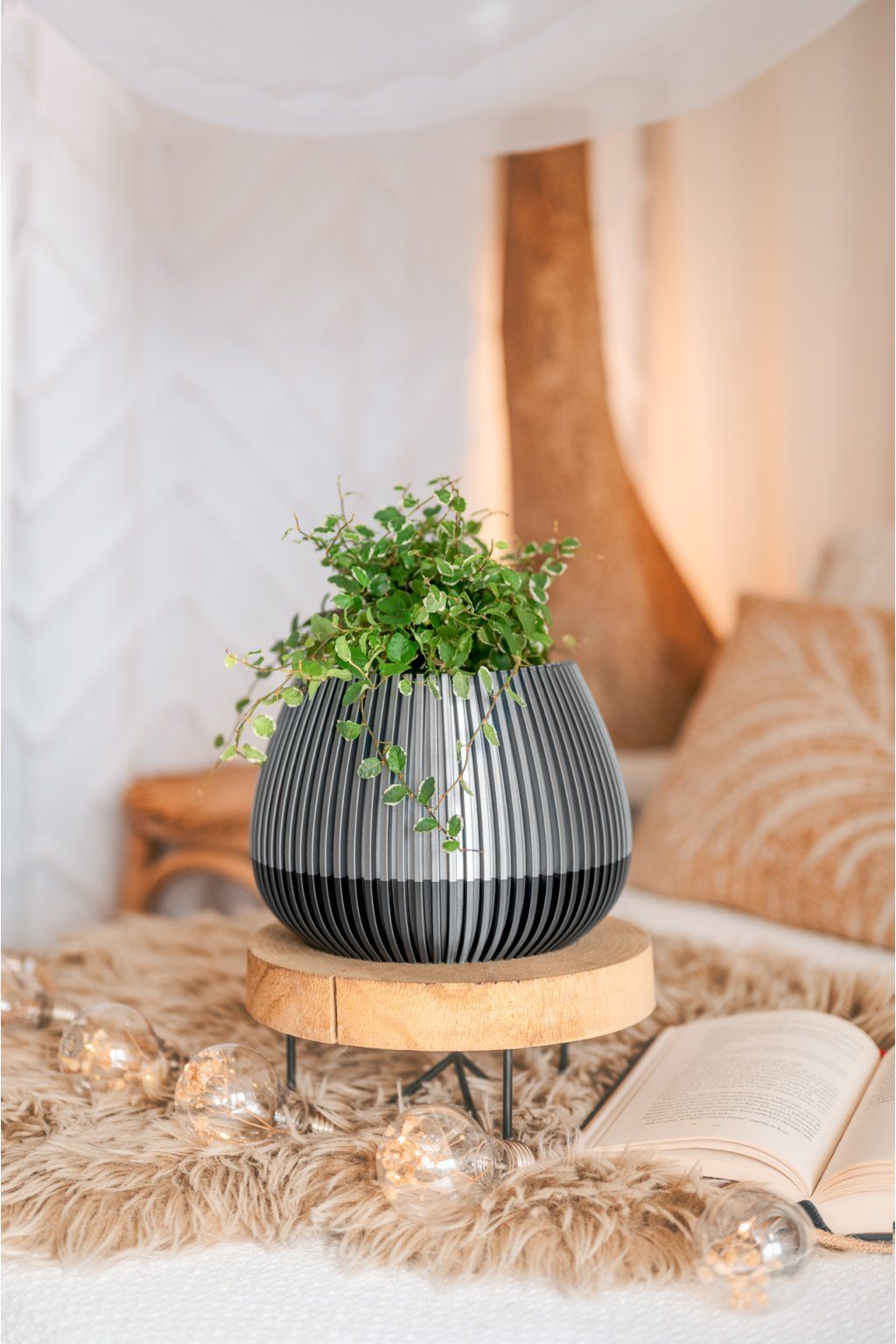 SET SPESSO od značky Fiedler zahrnuje tři elegantní interiérové doplňky – misku, květináč a vázu, které spolu tvoří harmonický celek. Saténový povrch s výraznými pruhy vytváří při dopadu světla jemnou hru odlesků a stínů, čímž každý prvek získává jedinečný charakter.