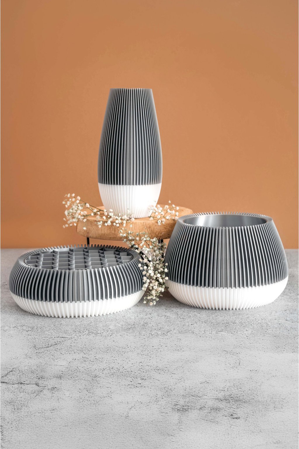 SET SPESSO od značky Fiedler zahrnuje tři elegantní interiérové doplňky – misku, květináč a vázu, které spolu tvoří harmonický celek. Saténový povrch s výraznými pruhy vytváří při dopadu světla jemnou hru odlesků a stínů, čímž každý prvek získává jedinečný charakter.