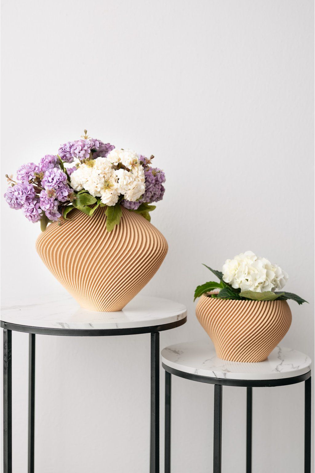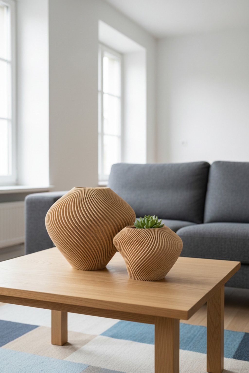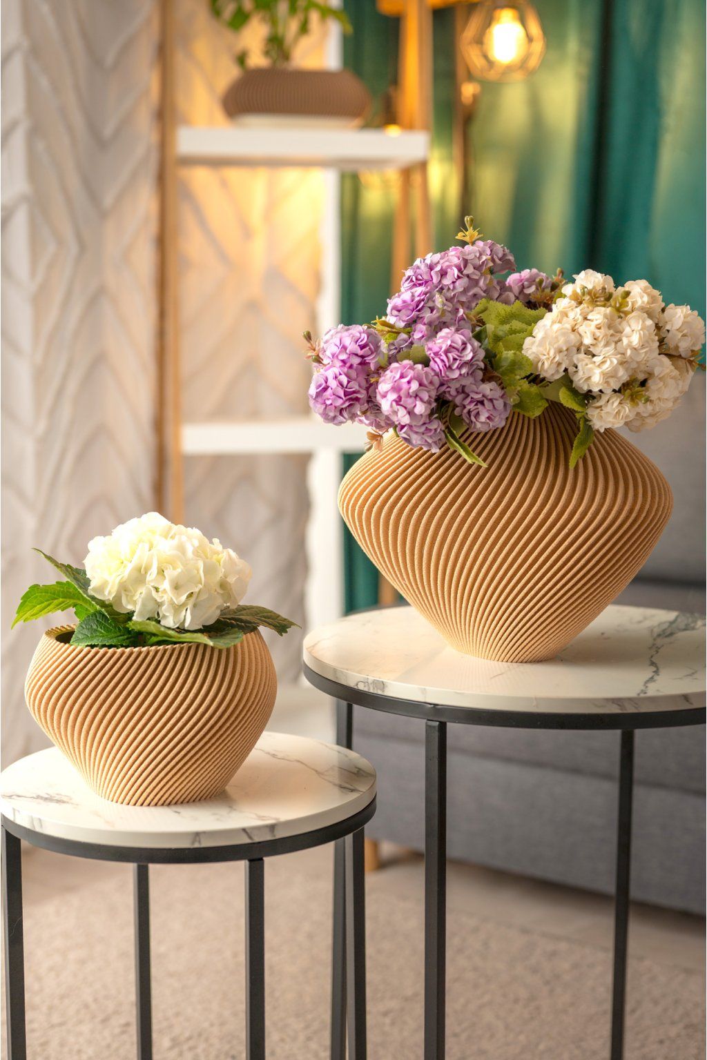 - Designová kompozice: Váza a květináč společně vytvářejí harmonický celek, který v interiéru působí jako promyšlený dekorativní prvek.