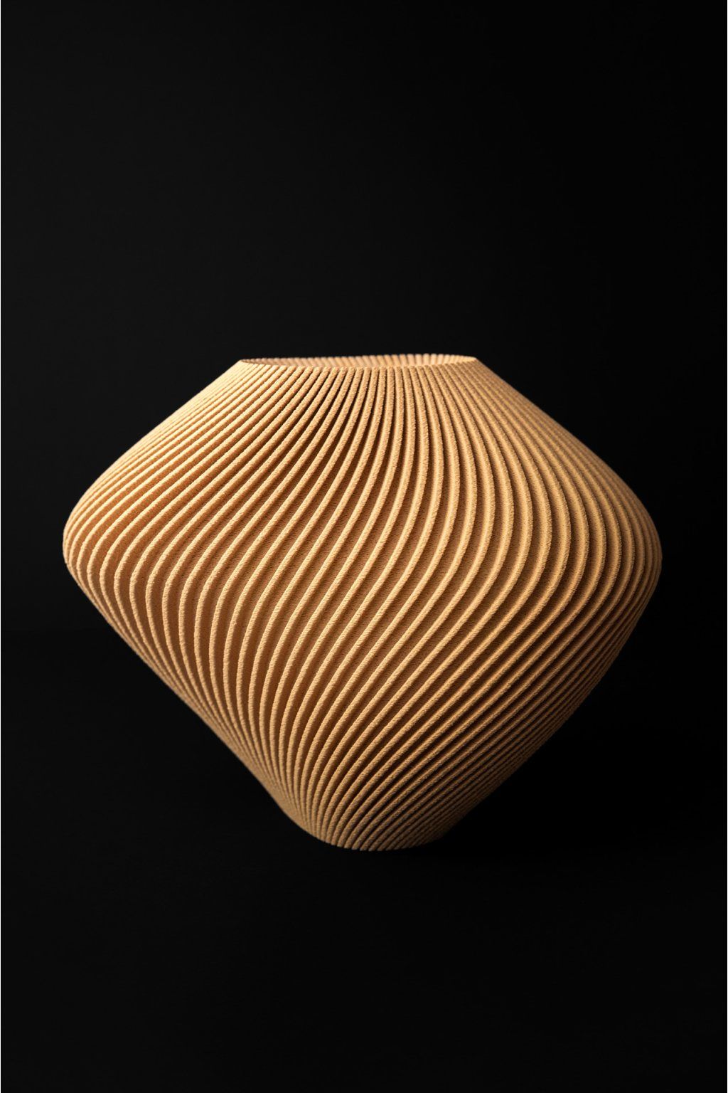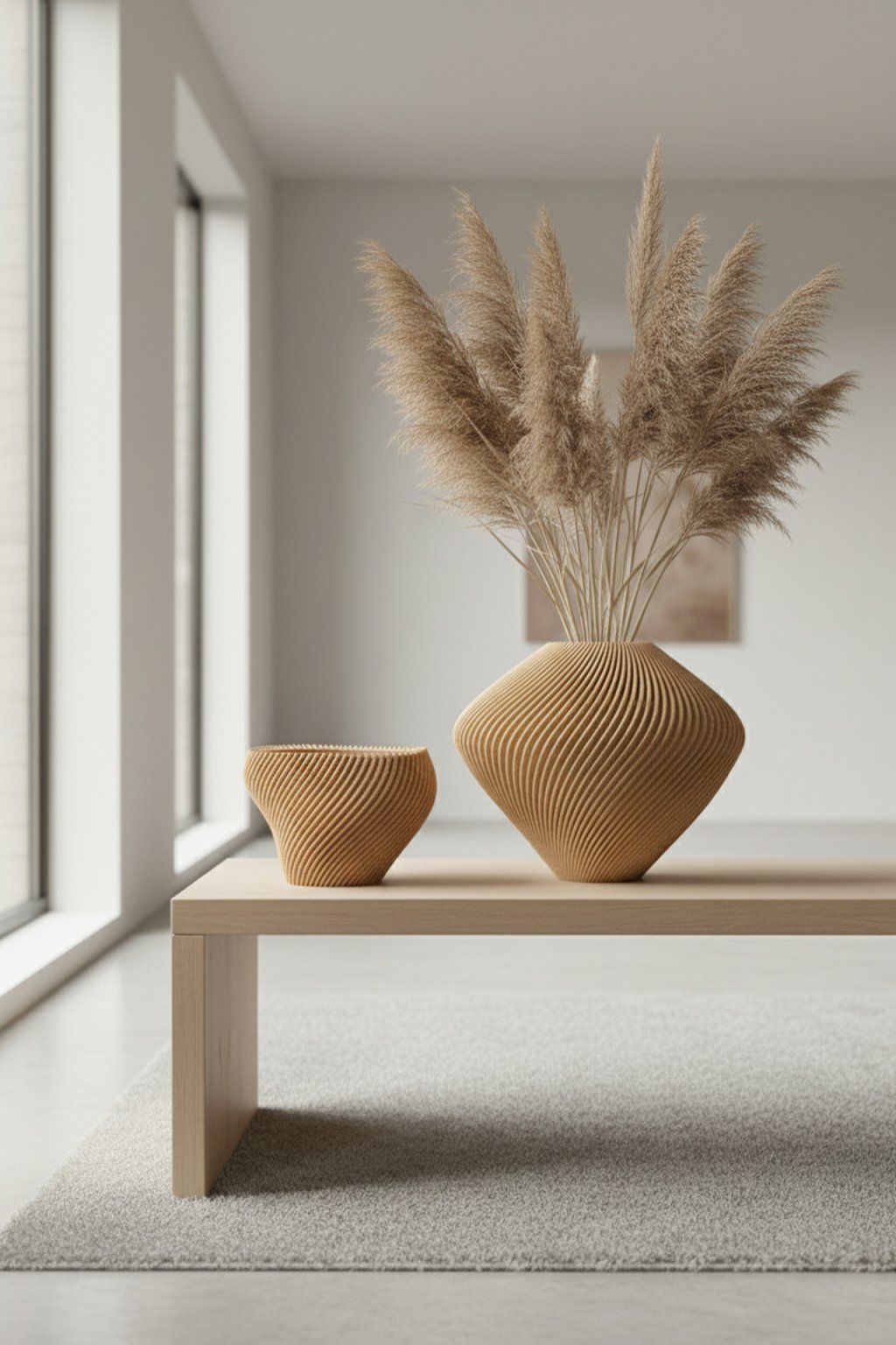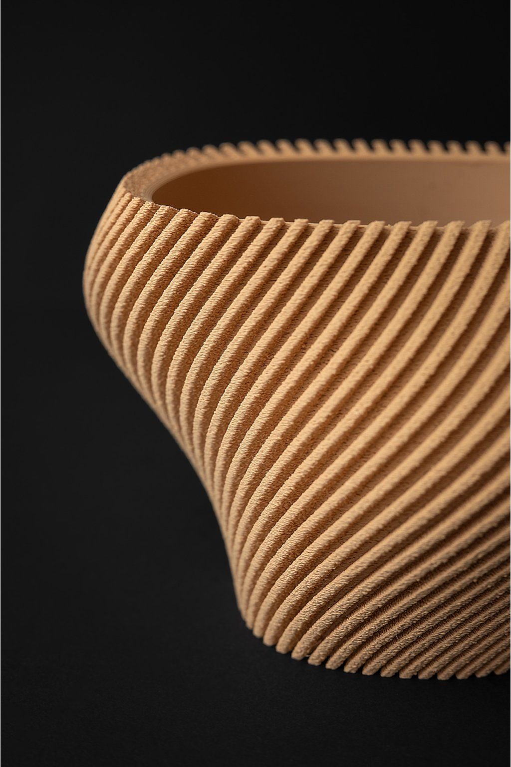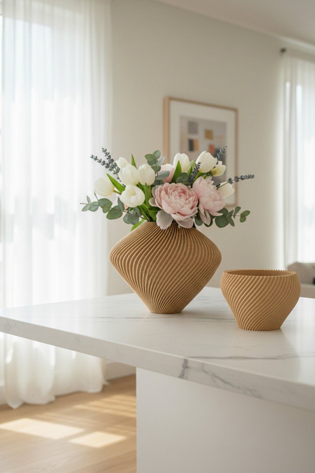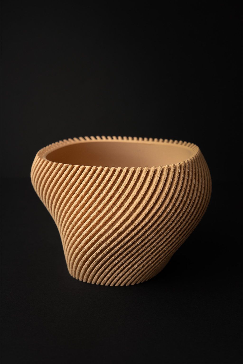 Set Torace představuje harmonické spojení dvou designových objektů, které spolu vytvářejí jednotný vizuální celek. Váza a květináč sdílejí charakteristický spirálovitý reliéf a rytmické vertikální linie, které definují celou kolekci Torace. Společně vytvářejí kompozici, která v interiéru působí vyváženě, moderně a architektonicky