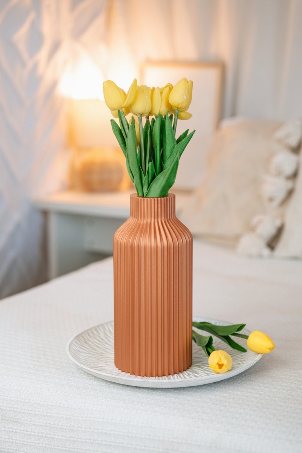 VÁZA BOTTIGLIA od značky Fiedler Design je elegantní interiérový doplněk, který zaujme svým saténovým povrchem a výraznými vertikálními pruhy. Ty při dopadu světla rozehrávají jemnou hru odlesků a stínů a dodávají váze neustále proměnlivý charakter.