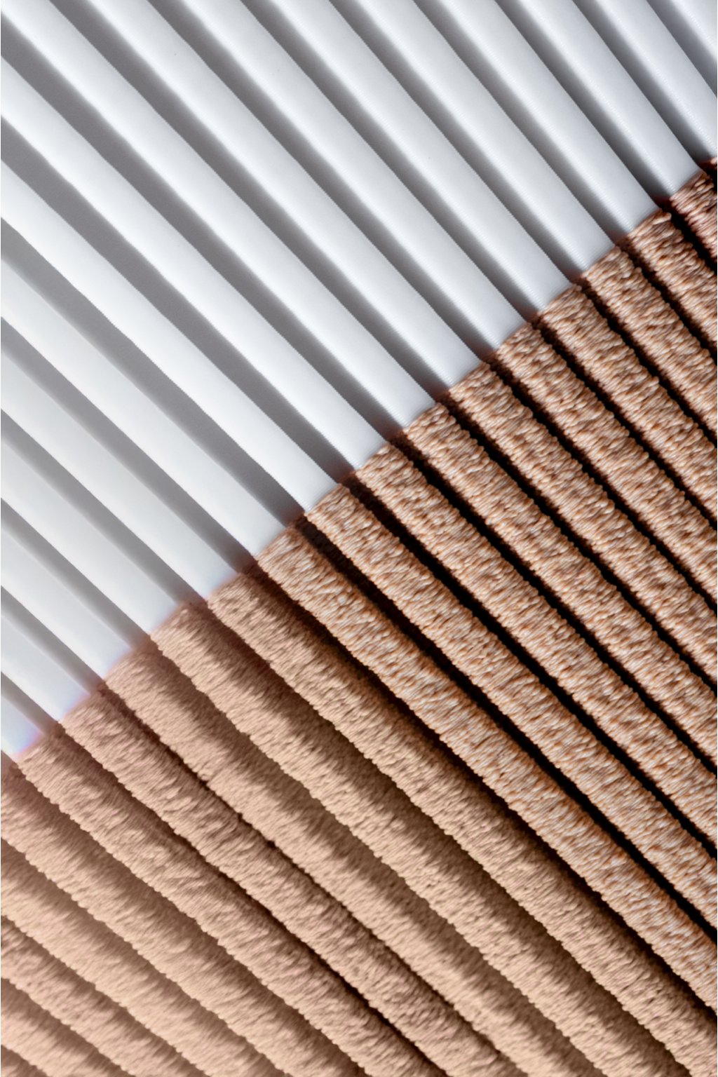 - Elegantní spojení saténu a dřeva s výraznými pruhy