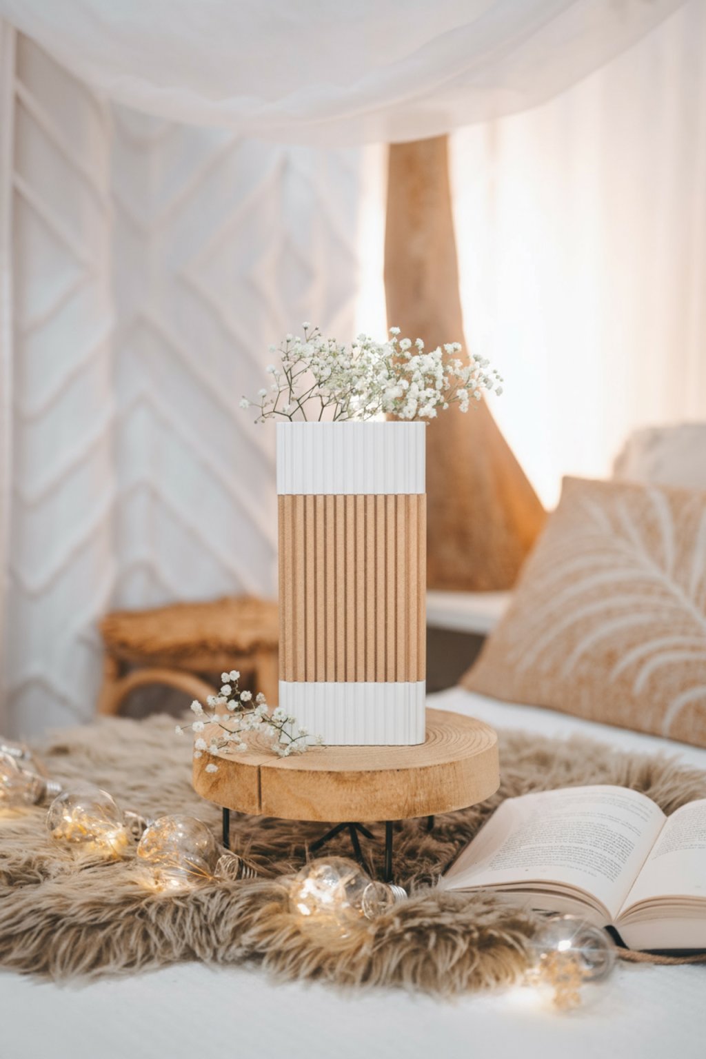 VÁZA TAVOLA od značky Fiedler Design je elegantní interiérový doplněk spojující jemnou strukturu dřeva se saténovým povrchem. Tento kontrast materiálů dodává váze přirozený a sofistikovaný vzhled, který působí harmonicky v jakémkoli interiéru.