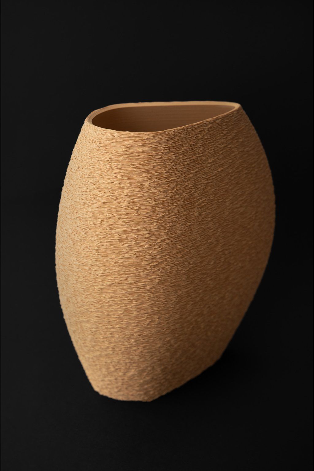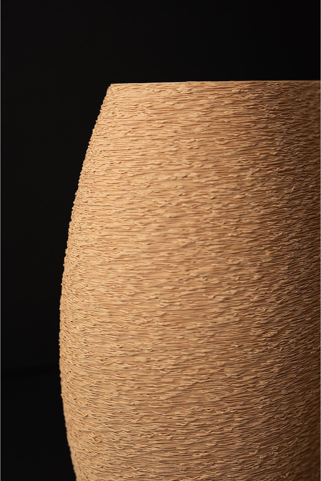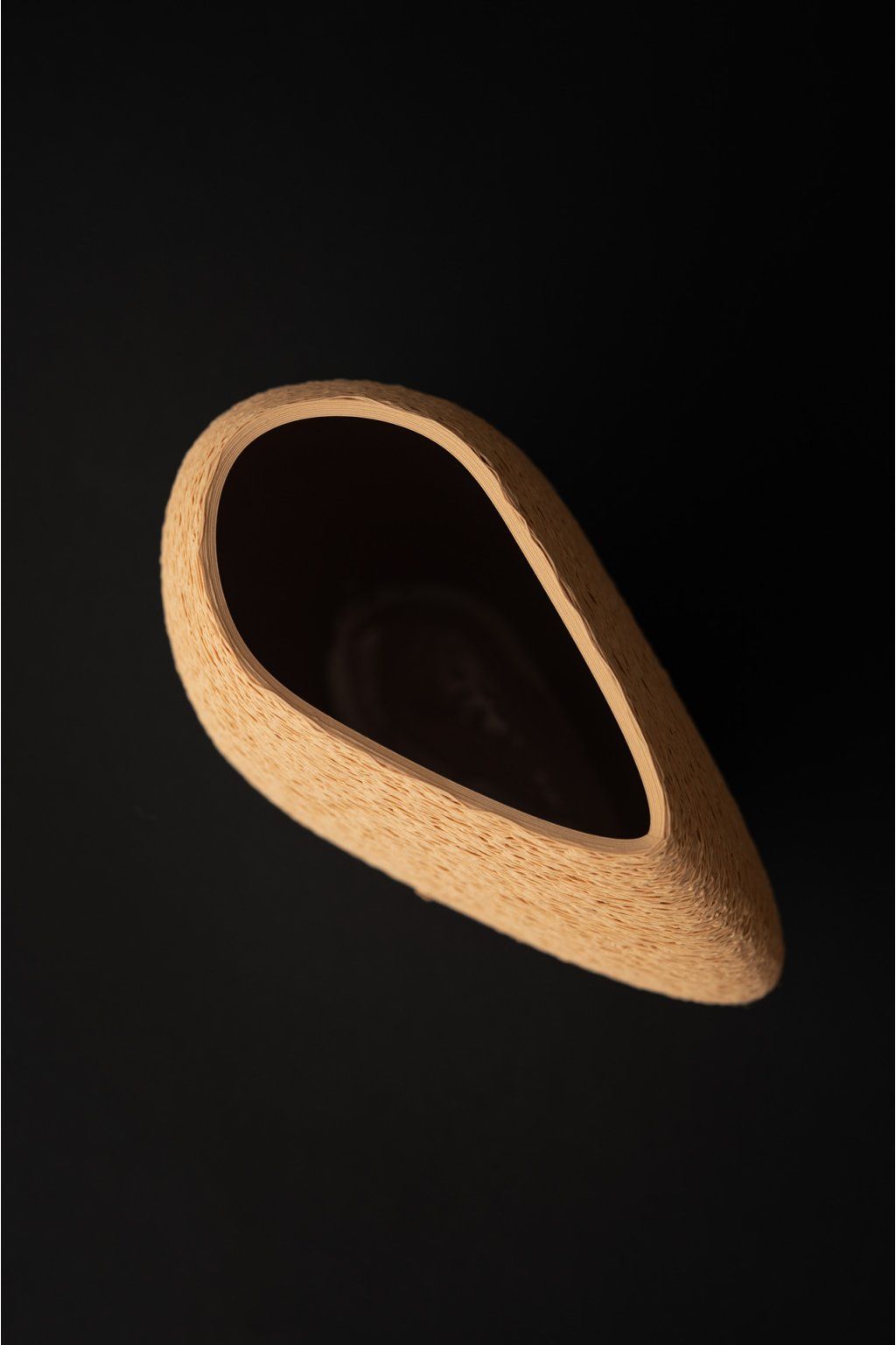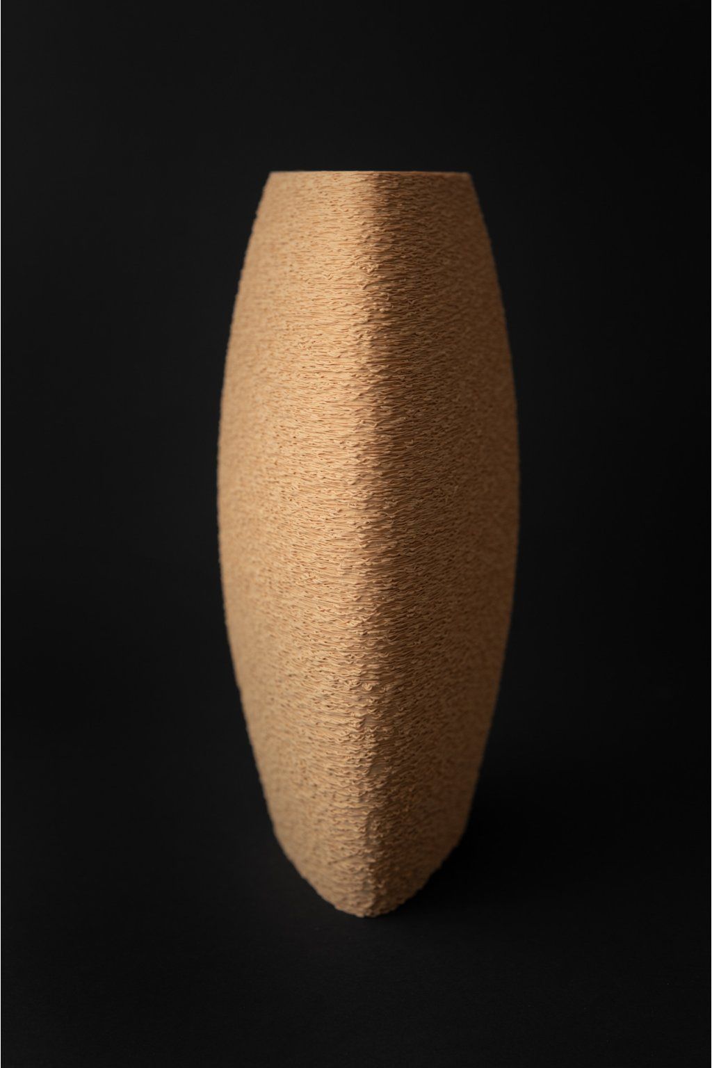 Váza VELA přináší do interiéru nečekanou vizuální hloubku skrze svou unikátní texturu. Povrch vázy, evokující kilometry jemné bavlněné nitě precizně navinuté kolem organického tvaru, vytváří fascinující hru světla a stínu. Každá horizontální linka vypráví příběh o trpělivosti a jemnosti, čímž dává vzniknout objektu, který vybízí k doteku.