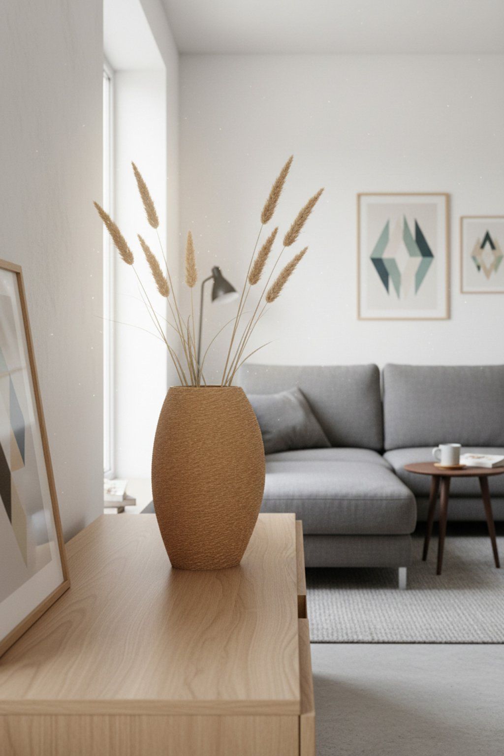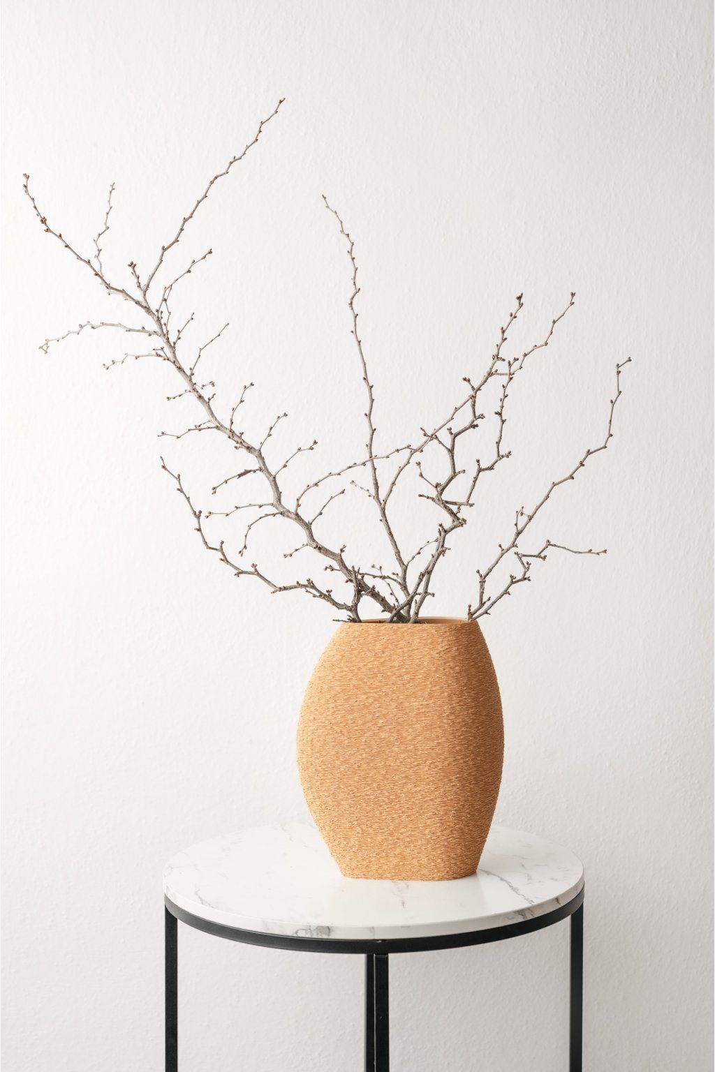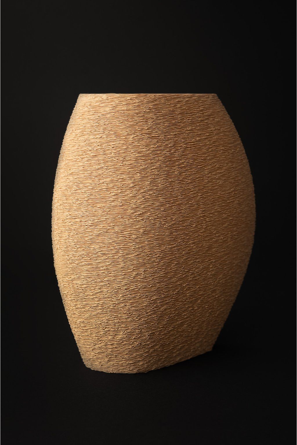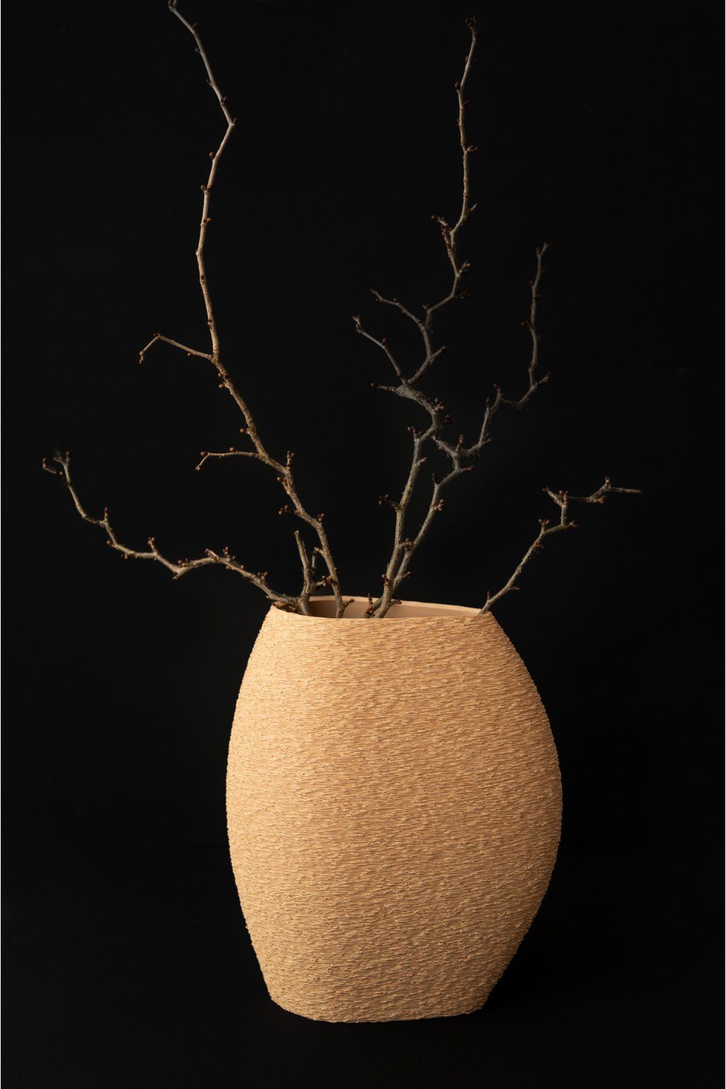 Váza VELA přináší do interiéru nečekanou vizuální hloubku skrze svou unikátní texturu. Povrch vázy, evokující kilometry jemné bavlněné nitě precizně navinuté kolem organického tvaru, vytváří fascinující hru světla a stínu. Každá horizontální linka vypráví příběh o trpělivosti a jemnosti, čímž dává vzniknout objektu, který vybízí k doteku.